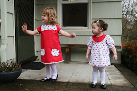 PS. I made their Christmas dresses. Lulu's is this pattern, with a bunch of piping I bought on sale at the Fabric Depot Outdoor Sale. Penny's dress is a vintage reproduction pattern I've made before. It came together in less than two hours and I added patch pockets just for fun. The trim on her dress is vintage. I had just enough left over after I sewed some Christmas pants for Penny, long ago. I don't love many Christmas fabrics, but this print of trees on top of cars by Dear Stella was pretty adorable. Since chopping down our tree and driving home with it on the roof is kind of a family tradition, the girls recognized this on the dresses, and really loved wearing them.